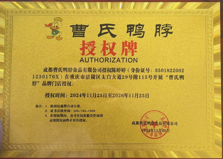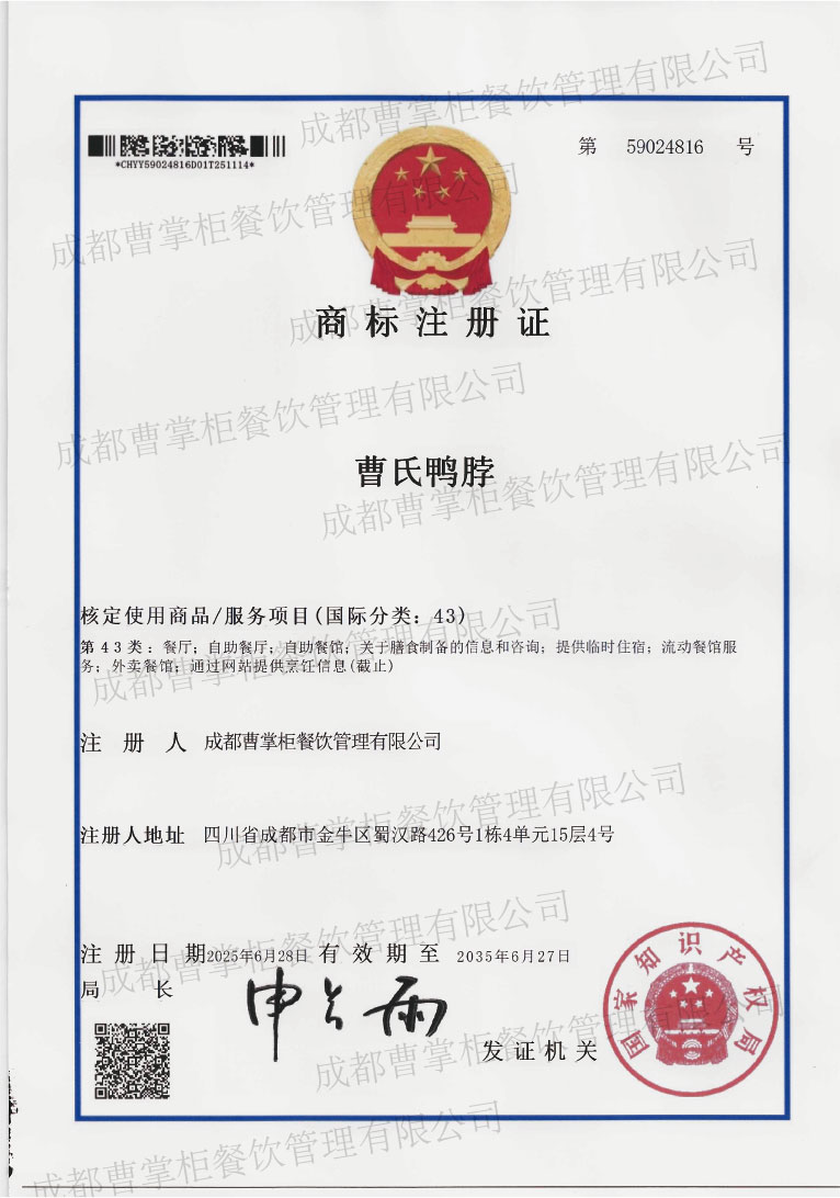曹氏鸭脖隶属于成都曹掌柜餐饮管理有限公司成立于 2015 年,是深耕热卤食品经营与技艺传承的专业餐饮管理企业,旗下品牌凭借正宗川味与匠心品质,成为消费者心中的热卤优选。